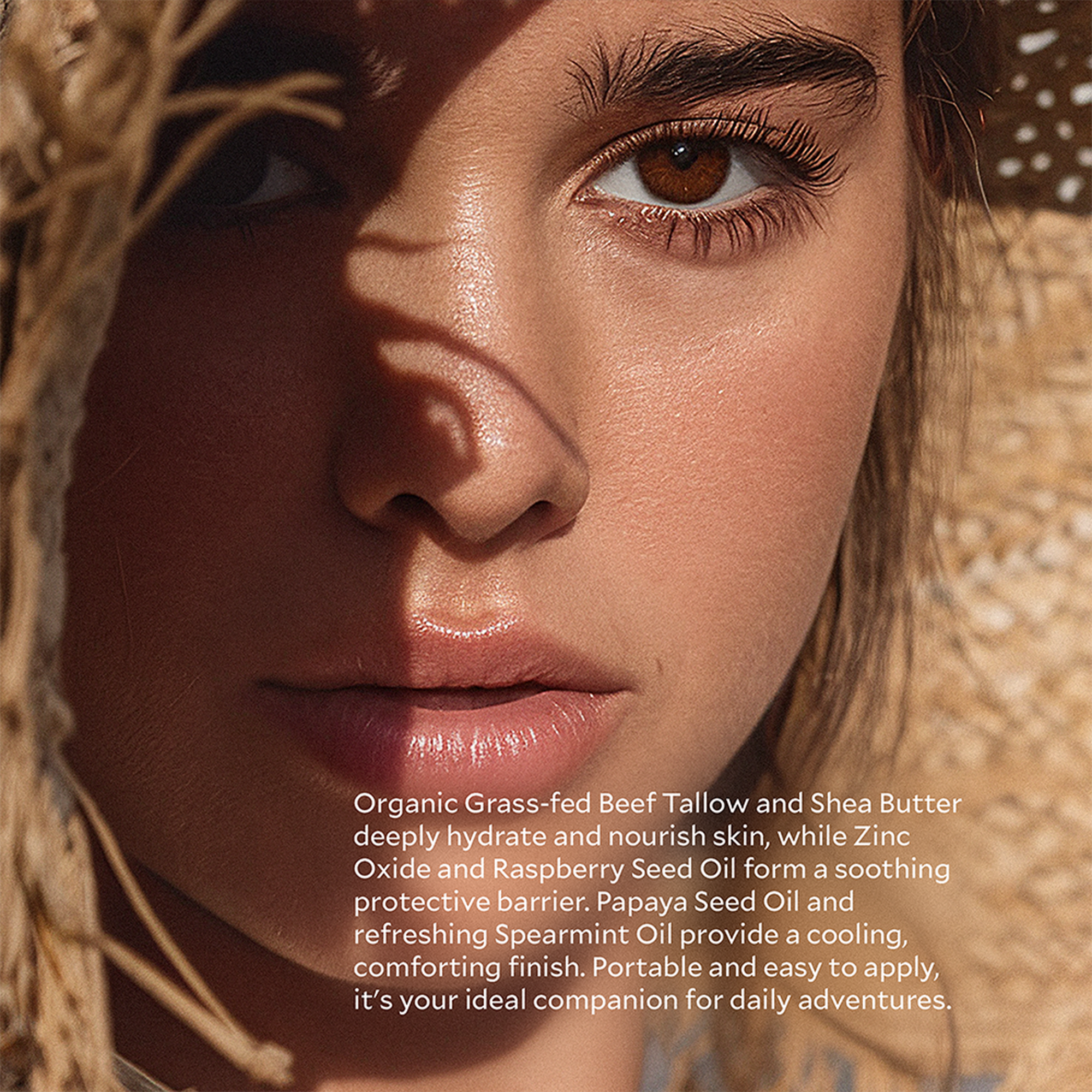 A nourishing balm stick designed to comfort and hydrate skin before and after sun exposure. Crafted with organic grass‑fed beef tallow, antioxidant‑rich raspberry seed oil, non‑nano zinc oxide for a calming barrier, soothing papaya seed oil, and refreshing spearmint oil, this stick moisturizes and comforts your skin. Ideal for all skin types, it’s easy to apply and free of synthetic additives.